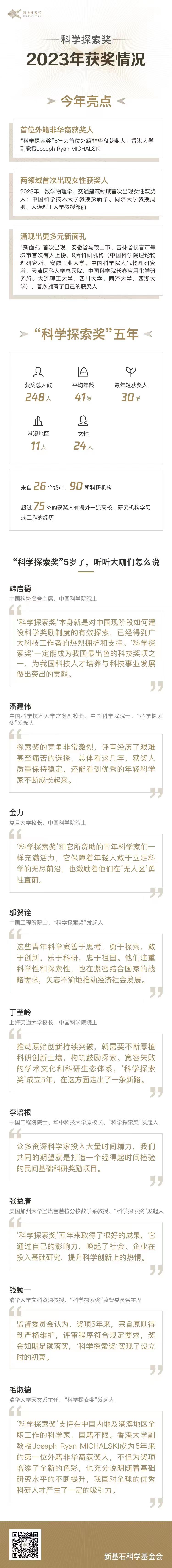 大皖新聞?dòng)?/strong> 7月17日,第五屆“科學(xué)探索獎(jiǎng)”獲獎(jiǎng)名單正式揭曉,48位青年科學(xué)家榜上有名,其中包括來(lái)自中國(guó)科大、安徽工業(yè)大學(xué)的多名安徽科學(xué)家,每位獲獎(jiǎng)人將在5年內(nèi)獲得總計(jì)300萬(wàn)元人民幣獎(jiǎng)金?!翱茖W(xué)探索獎(jiǎng)”由楊振寧、饒毅、施一公、潘建偉等14位知名科學(xué)家與騰訊基金會(huì)發(fā)起人馬化騰共同發(fā)起,五年來(lái)共資助了248位青年科學(xué)家。 中國(guó)科大教授成數(shù)學(xué)物理領(lǐng)域首位女性獲獎(jiǎng)人 “科學(xué)探索獎(jiǎng)”面向基礎(chǔ)科學(xué)和前沿技術(shù)十個(gè)領(lǐng)域,支持在中國(guó)內(nèi)地及港澳地區(qū)全職工作、45周歲及以下的杰出青年科學(xué)家,每位獲獎(jiǎng)人將在5年內(nèi)獲得總計(jì)300萬(wàn)元人民幣獎(jiǎng)金,并且可以自由支配獎(jiǎng)金的使用。 2023年獲獎(jiǎng)名單中,數(shù)學(xué)物理學(xué)領(lǐng)域的彭新華、能源環(huán)境領(lǐng)域的劉誠(chéng)、前沿交叉科學(xué)的石發(fā)展和張強(qiáng),均來(lái)自中國(guó)科大。而化學(xué)新材料領(lǐng)域的曾杰,來(lái)自安徽工業(yè)大學(xué)/中國(guó)科大。 據(jù)介紹,隨著國(guó)家基礎(chǔ)科研布局的廣度與深度不斷拓展,“科學(xué)探索獎(jiǎng)”出現(xiàn)不少“新面孔”。安徽省馬鞍山市、吉林省長(zhǎng)春市等城市首次有人上榜,同濟(jì)大學(xué)、西湖大學(xué)、安徽工業(yè)大學(xué)、天津醫(yī)科大學(xué)總醫(yī)院等9所科研機(jī)構(gòu),首次擁有了自己的獲獎(jiǎng)人,這也印證著中國(guó)科技創(chuàng)新的蓬勃發(fā)展和科研生態(tài)的不斷優(yōu)化。 另外,“科學(xué)探索獎(jiǎng)”特別關(guān)注女性科學(xué)家和年輕科學(xué)家的發(fā)展,在同等條件下,傾向年紀(jì)輕者和女性。2023年,數(shù)學(xué)物理學(xué)、交通建筑兩個(gè)領(lǐng)域首次出現(xiàn)女性獲獎(jiǎng)人。中國(guó)科學(xué)技術(shù)大學(xué)教授彭新華從事物理研究、同濟(jì)大學(xué)教授周穎從事土木工程研究、大連理工大學(xué)教授鄒麗從事船舶工程研究。她們的優(yōu)秀工作,打破了人們對(duì)女科學(xué)家的“刻板印象”。 中國(guó)科學(xué)技術(shù)大學(xué)常務(wù)副校長(zhǎng)、中國(guó)科學(xué)院院士、“科學(xué)探索獎(jiǎng)”發(fā)起人潘建偉表示,探索獎(jiǎng)的競(jìng)爭(zhēng)非常激烈,評(píng)審經(jīng)歷了艱難甚至痛苦的選擇,甚至很多相當(dāng)優(yōu)秀的申報(bào)人不得不成為“遺珠”??傮w看這幾年,獲獎(jiǎng)人質(zhì)量保持穩(wěn)定,還能看到優(yōu)秀的年輕科學(xué)家不斷成長(zhǎng)起來(lái),科學(xué)探索獎(jiǎng)將持續(xù)資助中國(guó)優(yōu)秀青年科學(xué)家群體,期待他們成為國(guó)家基礎(chǔ)研究加速前進(jìn)新的動(dòng)力。 楊振寧馬化騰等共同發(fā)起 五年資助248人 “科學(xué)探索獎(jiǎng)”設(shè)立于2018年。由楊振寧、饒毅、施一公、潘建偉、謝曉亮等14位知名科學(xué)家,與騰訊基金會(huì)發(fā)起人馬化騰共同發(fā)起。這是一項(xiàng)由新基石科學(xué)基金會(huì)出資、科學(xué)家主導(dǎo)的公益獎(jiǎng)項(xiàng),也是目前國(guó)內(nèi)金額最高的青年科技人才資助項(xiàng)目之一。獎(jiǎng)項(xiàng)秉持“面向未來(lái)、獎(jiǎng)勵(lì)潛力、鼓勵(lì)探索”的宗旨,鼓勵(lì)青年科技人才探索科學(xué)“無(wú)人區(qū)”,探索社會(huì)支持基礎(chǔ)研究人才持續(xù)穩(wěn)定的投入機(jī)制。 隨著新一屆獲獎(jiǎng)名單揭曉,科學(xué)探索獎(jiǎng)5年共資助248位青年科學(xué)家。248位獲獎(jiǎng)人來(lái)自26個(gè)城市,90所科研機(jī)構(gòu),平均年齡41歲,最年輕的獲獎(jiǎng)人30歲,其中超過(guò)75%的獲獎(jiǎng)人有海外一流高校、研究機(jī)構(gòu)學(xué)習(xí)或工作的經(jīng)歷。 “科學(xué)探索獎(jiǎng)”也得到科學(xué)界、教育界等多方的熱忱參與和支持。5年來(lái),有超過(guò)1300位各國(guó)院士,50多所著名高校校長(zhǎng)參與“科學(xué)探索獎(jiǎng)”的提名、推薦、評(píng)審,僅在提名推薦階段,就有40多位諾貝爾獎(jiǎng)、圖靈獎(jiǎng)、菲爾茲獎(jiǎng)等國(guó)際大獎(jiǎng)得主參與其中。