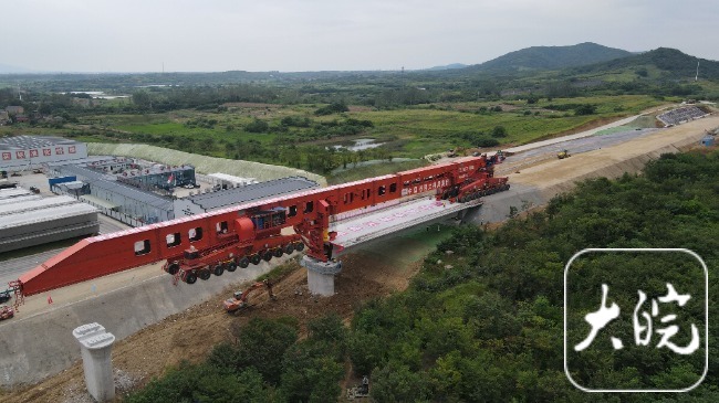 大皖新聞訊 記者從中國鐵路上海局集團(tuán)有限公司獲悉,8月27日13時30分,在合肥市肥東縣包公鎮(zhèn)施工現(xiàn)場,隨著“昆侖號—Ⅱ型”運(yùn)架一體機(jī)將長40.6米、寬12.6米、高3.25米,重930噸的箱梁穩(wěn)穩(wěn)地架設(shè)在南鷹莊特大橋橋臺——18號橋墩上,標(biāo)志著上海至南京至合肥高鐵首榀箱梁成功架設(shè),項(xiàng)目建設(shè)施工進(jìn)入全線架梁階段。