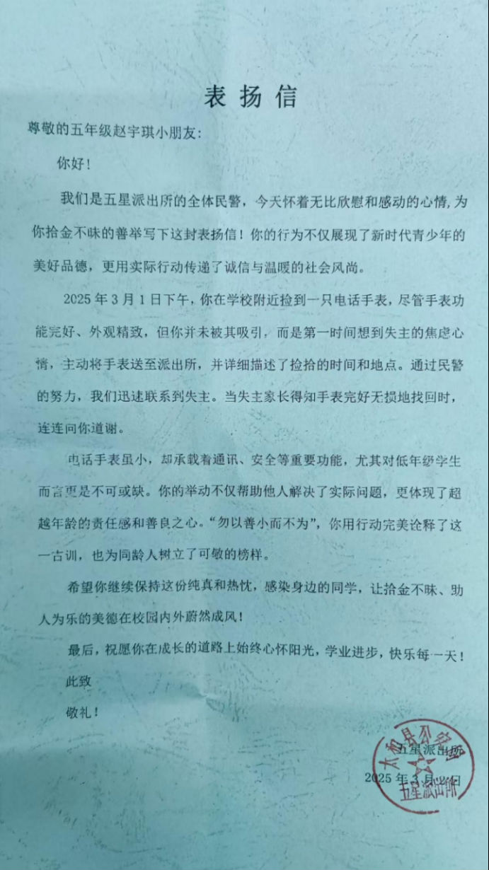 “今天我們來到這里,是為了對趙宇琪同學拾金不昧的精神進行表彰。希望各位同學都能向他學習,心懷正義,弘揚社會正能量,爭做新時代好少年?!?月3日下午,五星派出所民警帶著表揚信和榮譽證書來到五星鎮(zhèn)中心學校,為該校學生趙宇琪舉辦了一場特別的“表彰儀式”。