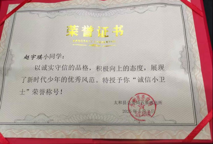 | 拾金不昧好少年 德育馨香滿校園 ——太和縣五星鎮(zhèn)中心學校趙宇琪同學獲“誠信小衛(wèi)士”表彰 |