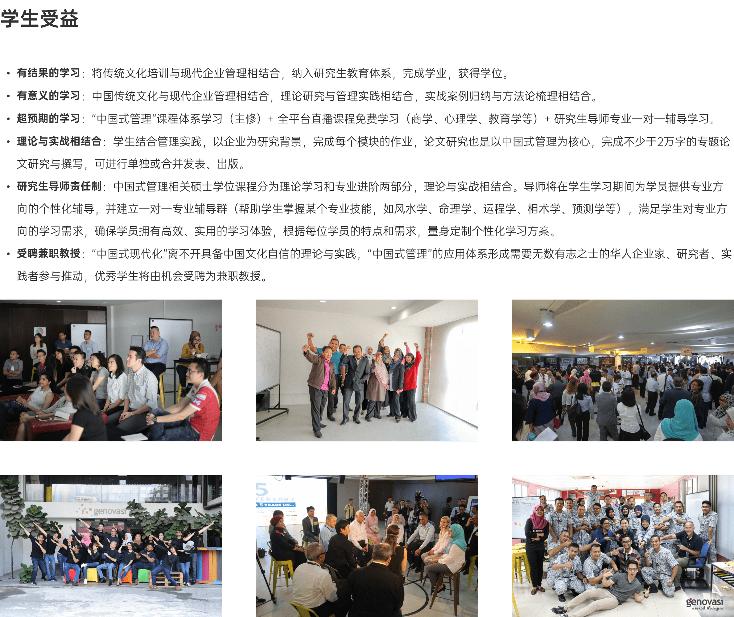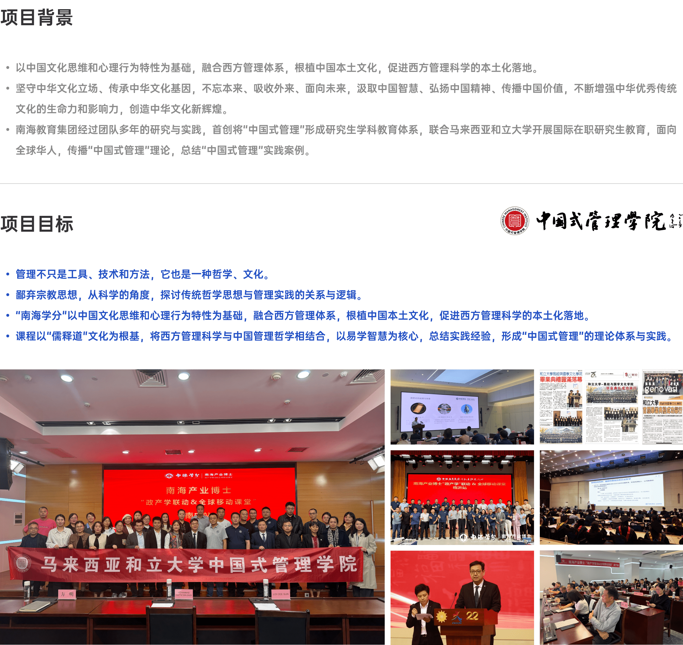 為弘揚(yáng)中國(guó)傳統(tǒng)文化,服務(wù)現(xiàn)代企業(yè)管理,深圳南海教育集團(tuán)有限公司與馬來西亞和立大學(xué)共同成立“中國(guó)式管理學(xué)院”,旨在以中國(guó)傳統(tǒng)文化與哲學(xué)思想為核心,借鑒、融合西方管理科學(xué),研究、探討、實(shí)踐符合中國(guó)本土化的經(jīng)營(yíng)理論、管理思想與實(shí)踐案例,幫助全球的華人企業(yè)家,拓寬思維,強(qiáng)化理論,知行合一,形成更符合華人思維的管理理論與實(shí)踐。